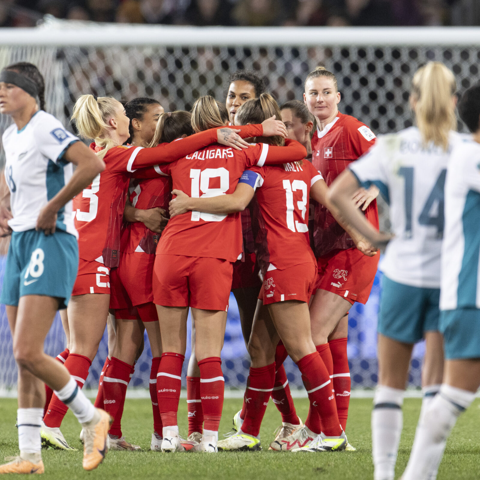 Switzerland's team player celebrate after the the FIFA Women's World Cup 2023 soccer match between Switzerland and New Zealand at the Dunedin stadium in Dunedin, New Zealand on Sunday July 30, 2023. (KEYSTONE/Michael Buholzer)